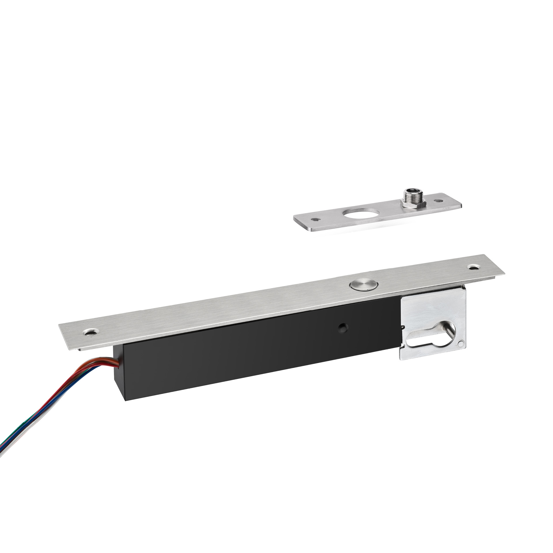 Electric drop pin lock for european cylinder. Fail safe function, only lock with electric power. The door stays open when there is no power. It can be opened in case of emergency by the cylinder.