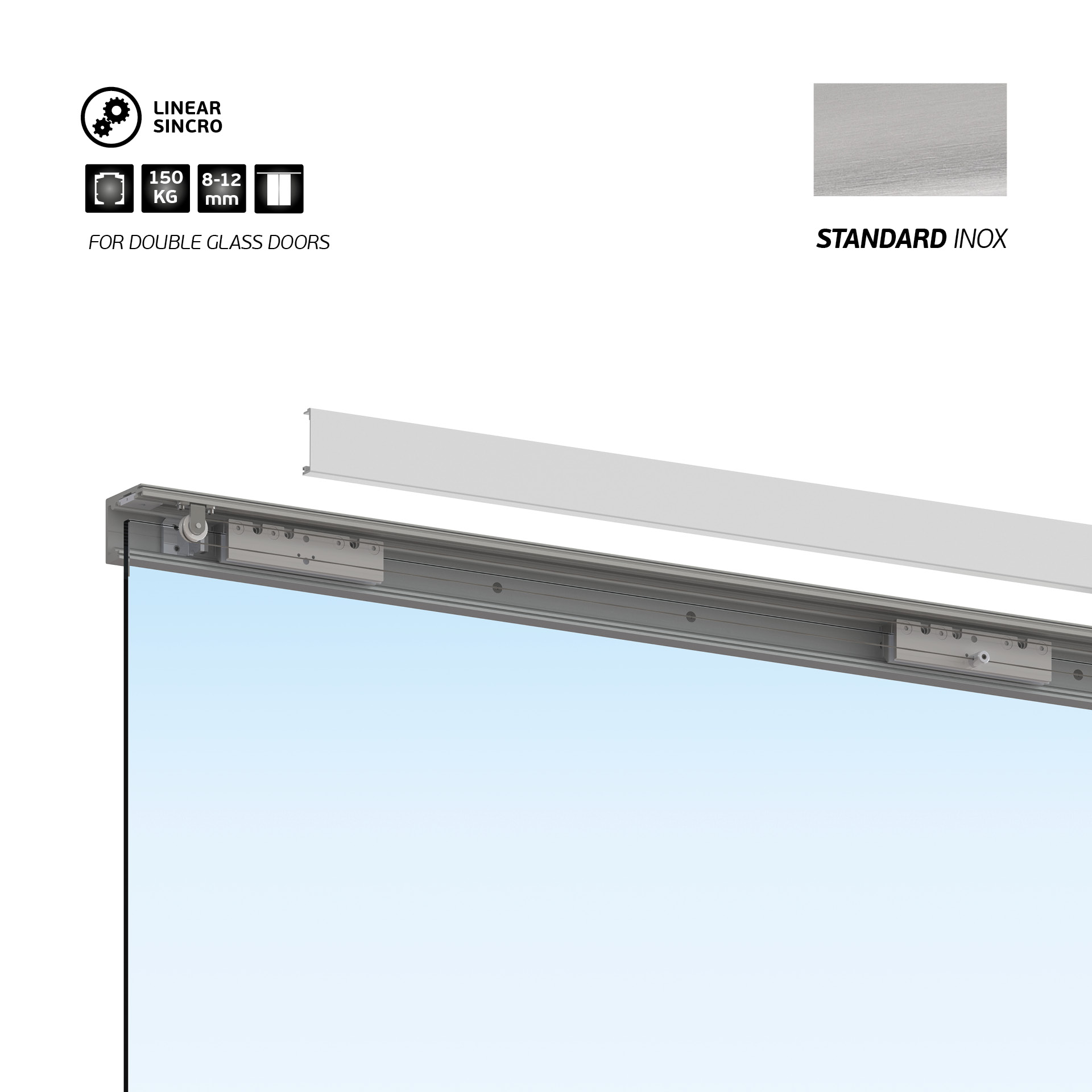 Manual system for synchronized doors. Suitable for large spans. Can be applied to double glass, timber, or metal doors, up to maximum weight of 150kg per door. No cutouts are required. LINEAR Sincro